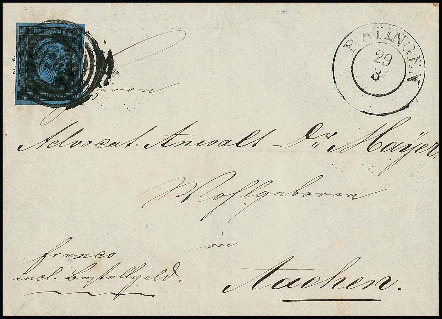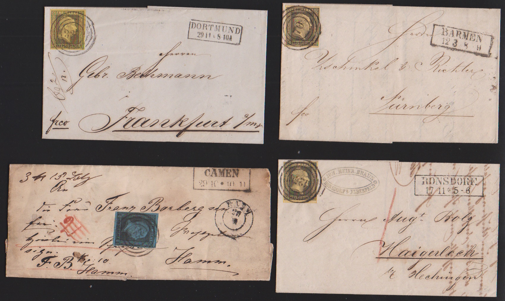 "70" (Barmen), "227" (Camen), "337" (Dortmund), "1202" (Ratingen), "1256" (Ronsdorf), fünf Prachtbriefe 2 Sgr. schw./blau bzw. 3 Sgr. schw./gelb
