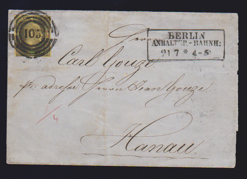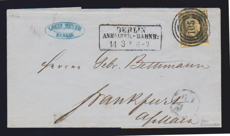 "105" je nebst Ra3 "Berlin Anhalter-Bahnh:" auf zwei Briefen 3 Sgr. (leichte Gebrauchsspuren bzw. einmal Randlinienschnitt)