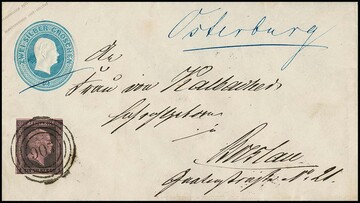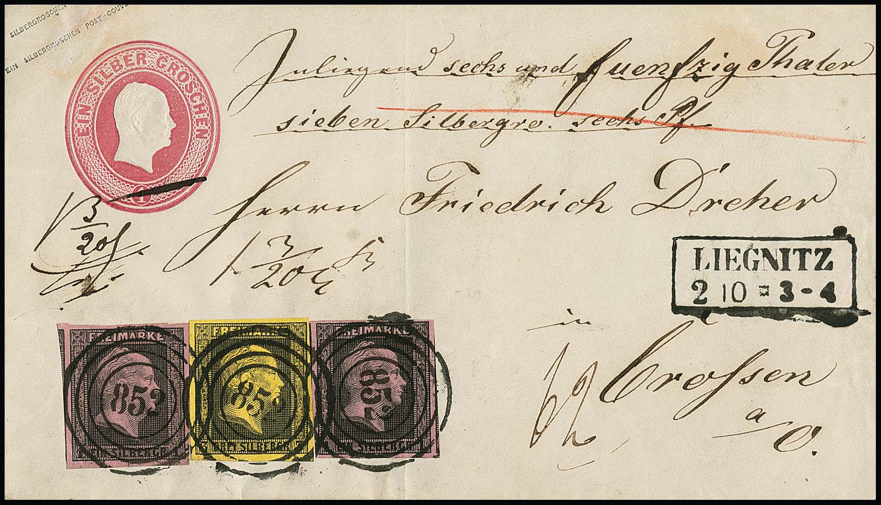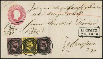 "852" nebst Ra2 "Liegnitz" auf Ganzsachen-Vs. 1 Sgr. (Bugspur) mit ZuF 1(2) und 3 Sgr.