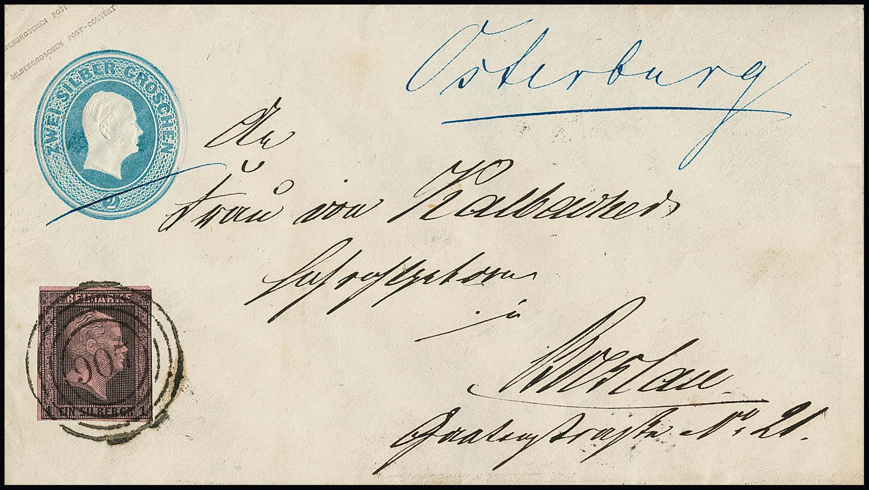 "907" (Magdeburg Bahnpost, Stahltype), nebst hs. Bahnpost-Aufgabe "Osterburg", auf Ganzsache 2 Sgr. mit ZuF 1 Sgr. (rechts Randlinienschnitt)