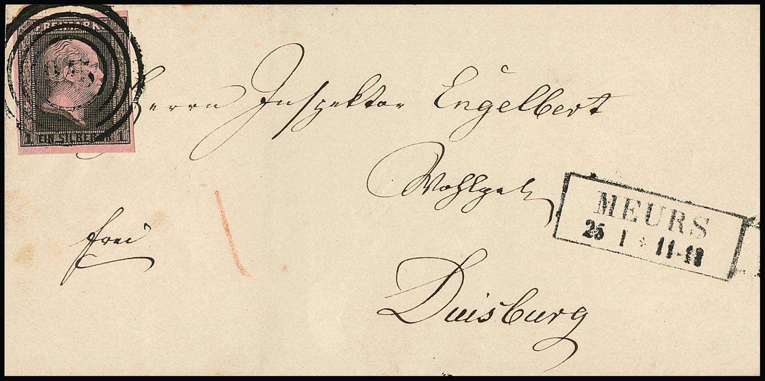 "945" nebst Ra2 "Meurs" auf Kabinettbrief 1 Sgr. schwarz auf typisch lilarosa-farbenem Papier