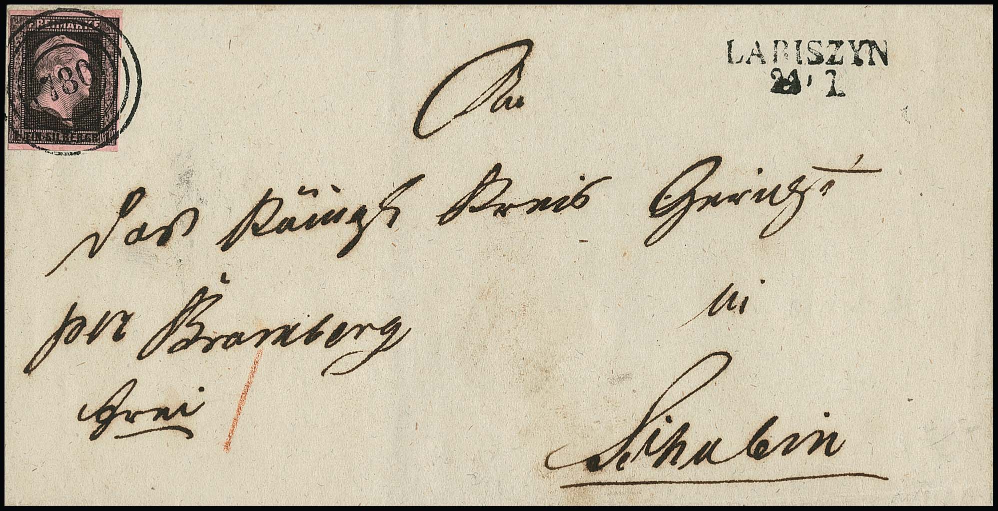 "780" nebst L2 "Labiszyn" auf Brief 1 Sgr. in typischer lilarosa Nuance (links unten "Lupenrand")
