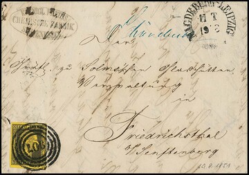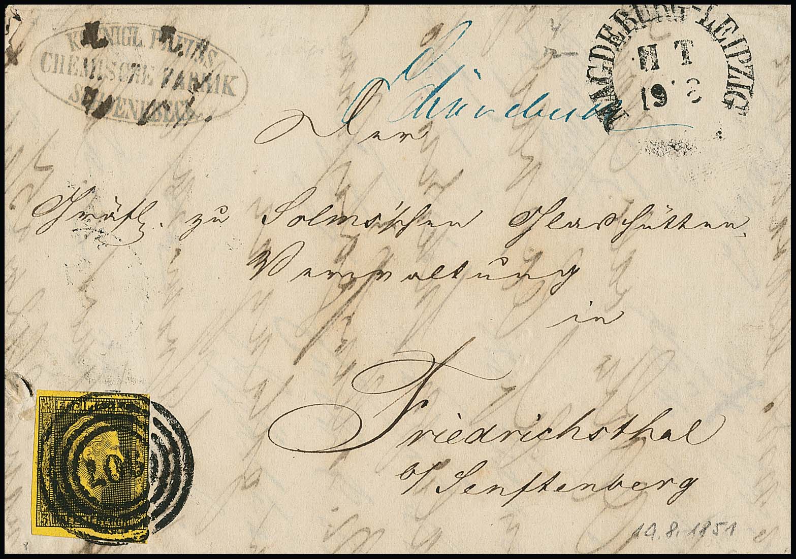 "907" nebst Bahnpoststempel "Magdeburg-Leipzig" (Bogenstempel), sowie klar hs. "Schönebeck", auf Brief 3 Sgr. schw./gelb (min. berührt) nach Friedrichsthal bei Senftenberg, rs. Bahnpost-Bogenstempel "Berlin-Leipzig" vom 19.8.1851
