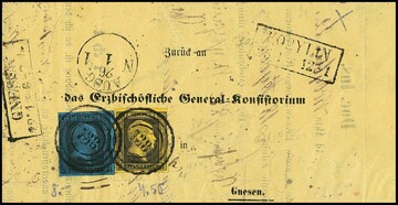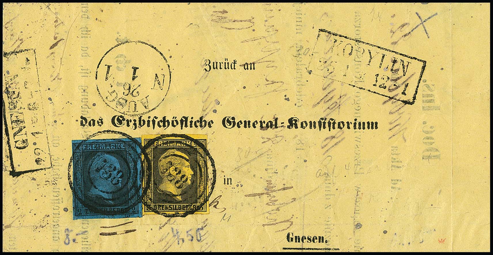 "738" nebst Ra2 "Kobylin" auf dekorativem gelbem Vordruck-Post-Ins.-Doc. mit 2 und 3 Sgr. (diese kleiner Eckbug) nach Gnesen