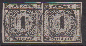 1 Kr. schwarz, breitrandiges gest. Kabinett-Paar, links auf voller Länge mit Teil der Nebenmarke, Fotoexp. Stegmüller "einwandfrei"