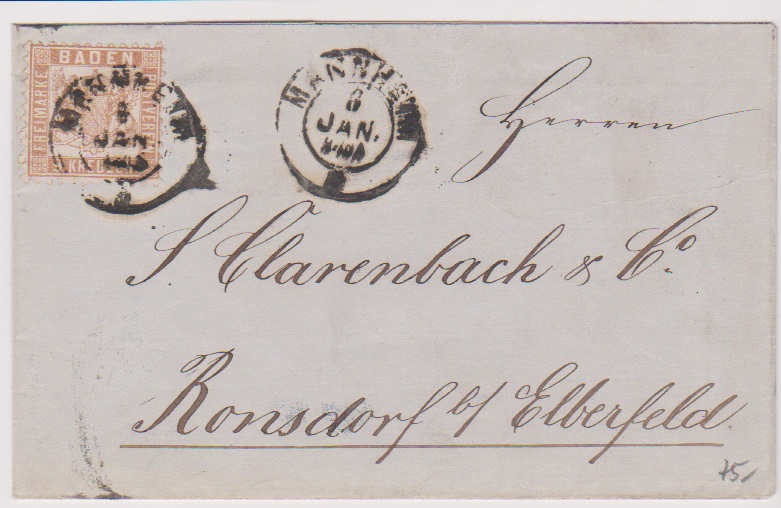 3 Kr. rosa, etwas schwer gestempelt, aber tadellos, auf eingeschriebenem Expreß-Brief von Weinheim nach Carlsruhe. Hs. "per Expreß" und "9 Wfr." für bar bezahlte Expreßgebühr (neben dem Reco-Porto), roter Charge-L1 sowohl vs. als auch rs., Brief rs. kleine Öffnungsmängel. Expreßbriefe von Baden sind selten!