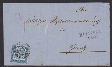 9 Kr. karmin, bis auf einen kurzen Zahn gut gezähnt, auf Faltbrief von Mannheim 1861 nach Aix/Frankreich, Mi. 600,-