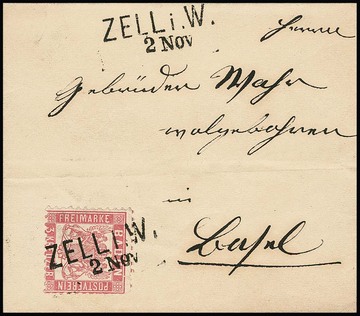 3 Kr. rosa, seltene enge Zähnung in guter Beschaffenheit, Kabinettbriefstück mit NS "104" (Offenburg), sign. Seeger. Mi. 350,-