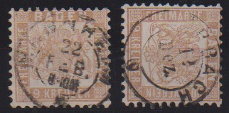 9 Kr. karmin, seltenes gestempeltes Paar mit klaren NS "79" (Lahr), rechte Marke oben ein kurzer Zahn, sonst tadellos, sign. Seeger, Fotoexp. Stegmüller. Mi. 600,-