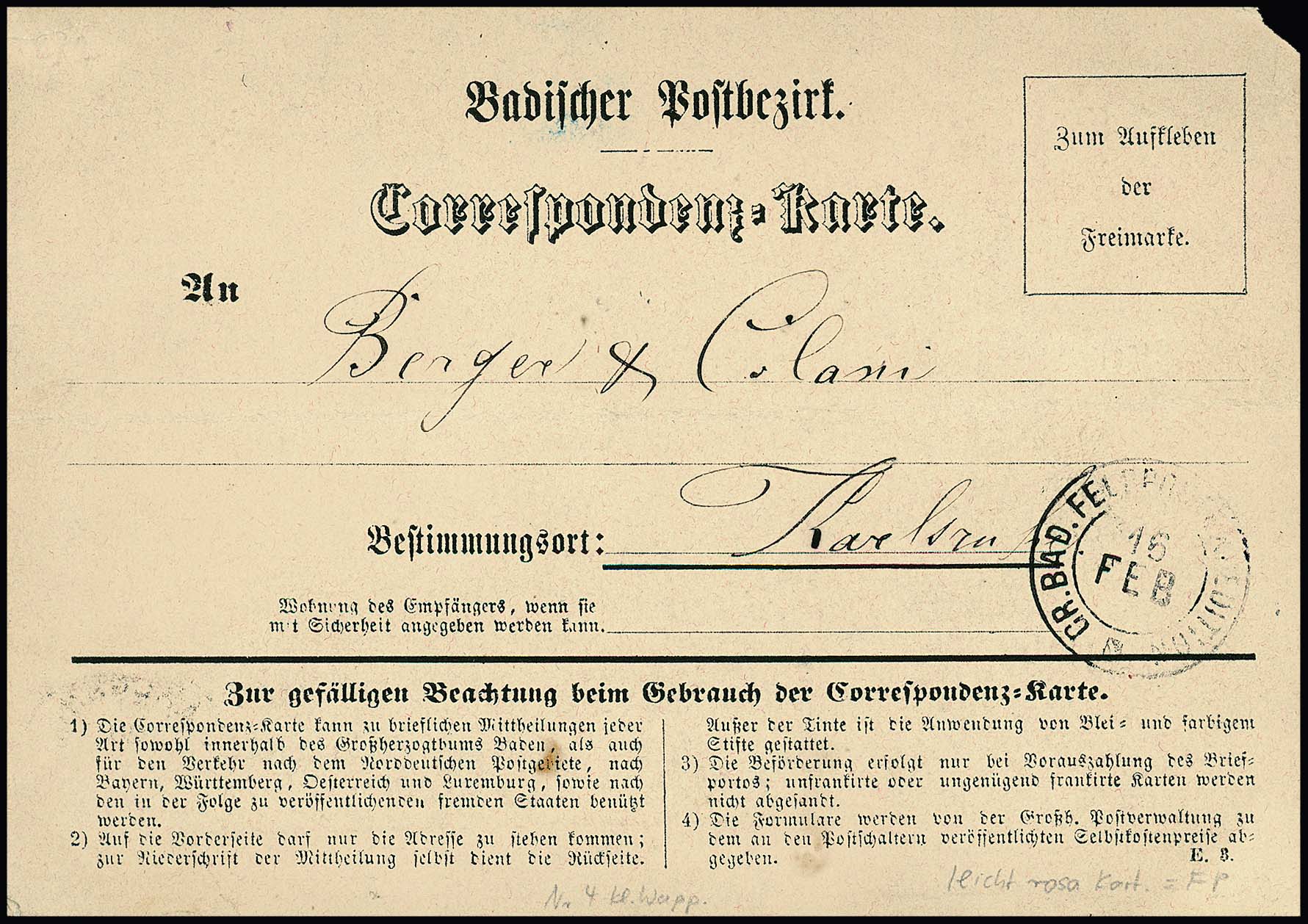 Feldpost, 1871, K2 "Gr. Bad. Feldpostexpedition" auf Correspondenzkarte (übliche Mittelfalte und leicht schräge Ecke) nach Karlsruhe