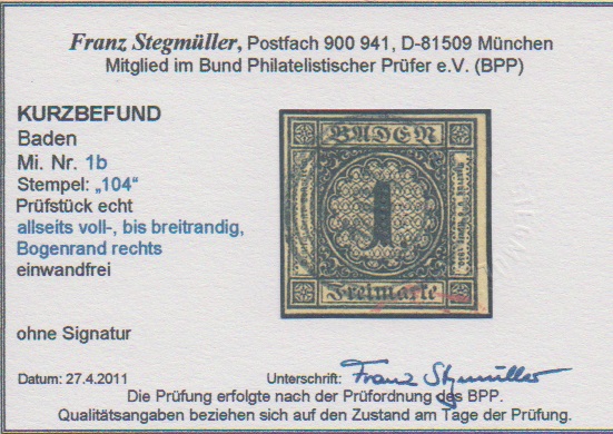 1 Kr. schw./bräunlich, allseits voll- bis überrrandig, zwei Seiten Nebenmarken, auf Kabinettbriefstück mit NS "8" (Baden), Marke war zur Qualitätsprüfung gelöst. Sign. Pfenninger und Fotoexp. Stegmüller. Mi. 320,- +