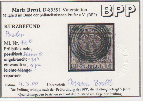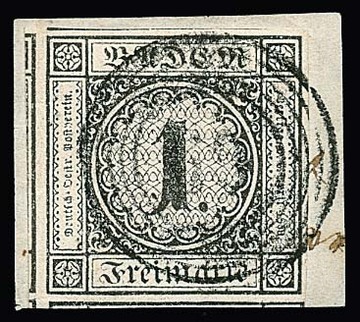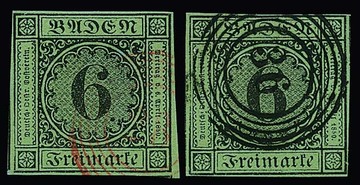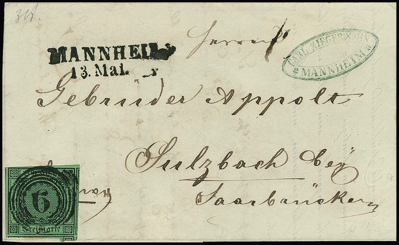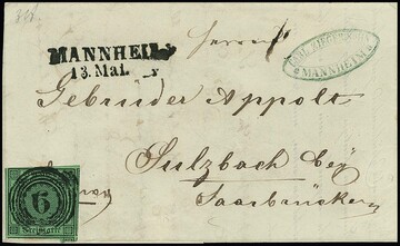 6 Kr. schw./gelbgrün vom Unterrand in Mischfrankatur mit 1 Kr. schwarz, teils Schnittfehler, auf ursprünglichem Faltbrief von Mannheim nach Lahr, seltene Kombination, in der Slg. Koch war nur ein Briefstück enthalten mit Verweis auf nur noch einen weiteren existierenden Brief mit dieser Mischfrankatur
