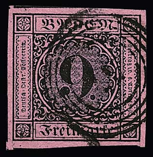 9 Kr. schw./dunkelrosa, hervorragend riesenrandiges Kabinettstück mit Teilen von Nebenmarken an allen (!) vier Seiten