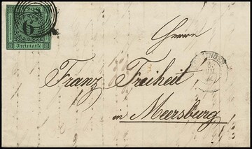 6 Kr. schw./gelbgrün, überdurchschnittlicher "Schnittriese", oben vom Bogenrand, alle anderen Seiten teils größere Teile der Nebenmarken, auf Kabinett-Brief von Mannheim 1853 nach Saarbrücken