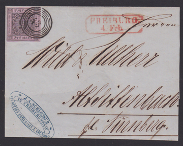 9 Kr. schw./rosa, kleine rechte obere Luxus-Bogenecke auf Teilbrief aus Freiburg