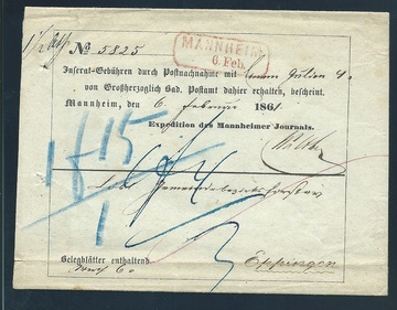 "Mannheim", 1861, seltener roter Ra2 mit "halbrunden" Ecken auf NN-Vordruck-Couvert für Inseratsgebühren der Mannheimer Zeitung