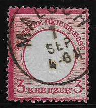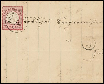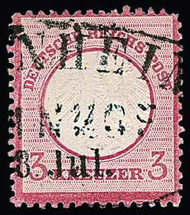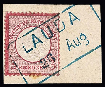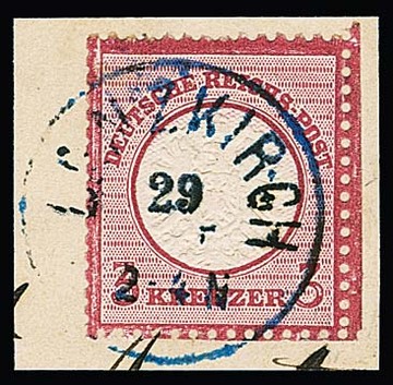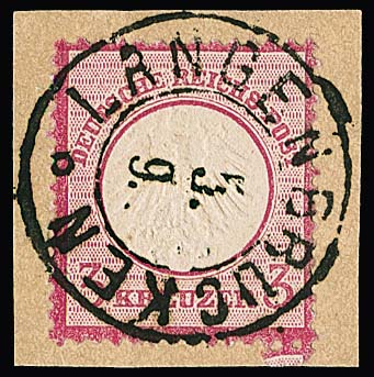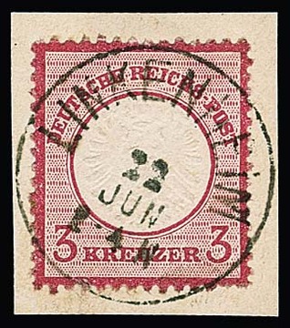 "Mannheim Bahnhof", sehr seltener nachverwendeter großer Ovalstempel klar auf 3 Kr. kl. Brustschild (ganz min. "eckrund"). Attest Krug: "Der sehr seltene Stempel ist gut lesbar mittig aufgesetzt."