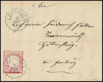"Löffingen", seltener nachverwendeter blauer K1 klar auf Faltbrief mit Kabinettstück 3 Kr. kl. Schild (Fotoexp. Krug), ferner auf loser Marke, sowie in schwarz auf Brief und Briefstück 3 Kr.