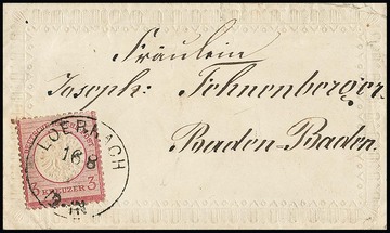 "Lörrach", nachverw. K2 (mit Wappen) klar auf Brief und Briefstück 3 Kr. Brustschild, ferner ohne Wappen auf Briefstück 3 Kr., sowie der Ablöse-K1 u.a. auf hübschem kleinem Präge-Zierbrief mit 3 Kr. (Fotoexp. Krug)