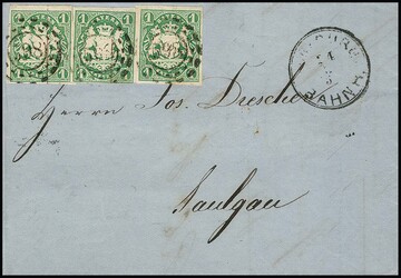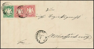 1 Kr. grün auf tadelloser Drucksache, sowie Kabinettstück 3 Kr. blau auf kleinem Chargé-Briefchen, beide aus Augsburg