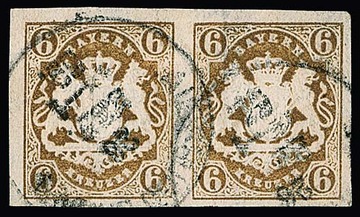 6 Kr. braun, breitrandiges Prachtpaar mit K1 "Augsburg Bahnhof", rechte Marke Seidenfaden oben unbedeutend gelockert, Mi. 380,-
