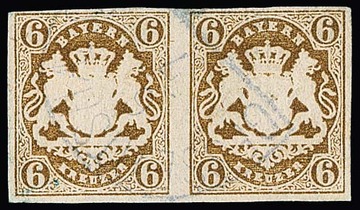 6 Kr. ockerbraun, Prachtpaar mit zartem blauem HK "Gessertshausen", Mi. 380,-