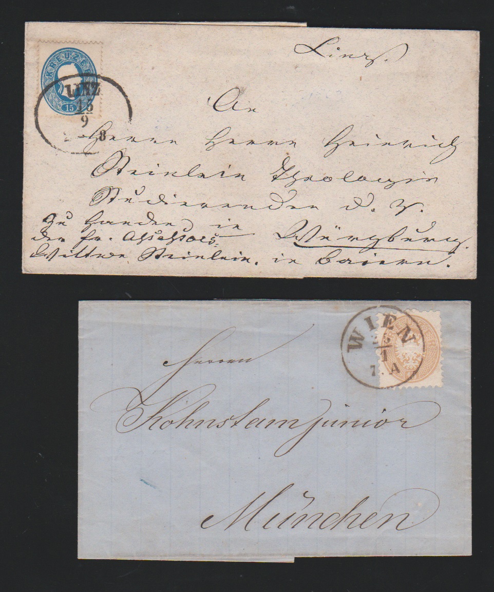 Incoming-Mail, 1863/65, zwei Briefe je mit Österreich 15 Kr. blau (aus Linz) bzw. 15 Kr. hellbraun (aus Wien) nach Bayern