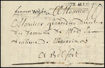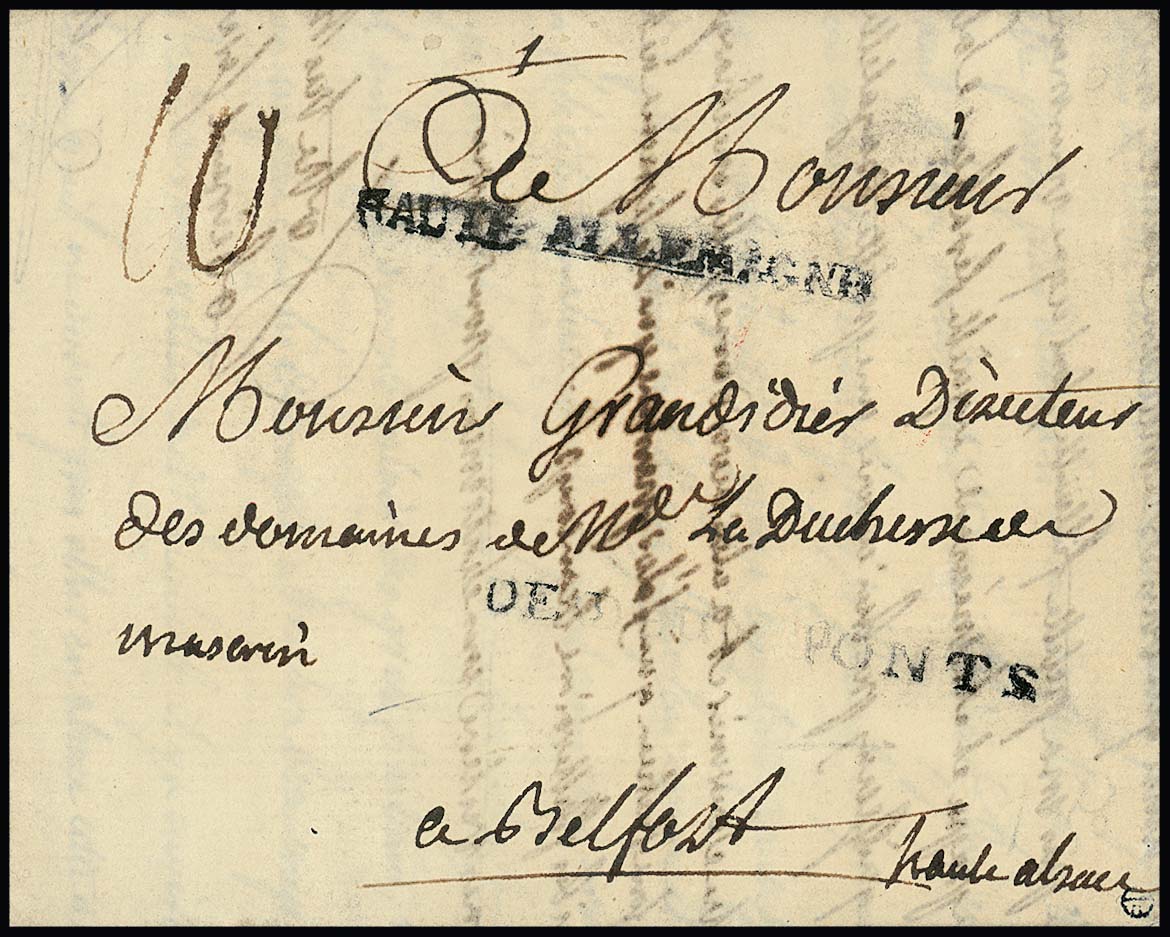 "Zweibrücken", teils schwacher L1 "DE DEUX-PONTS" nebst L1 "HAUTE ALLEMAGNE" (kl. Type) auf kleinem Brief 1776 nach Belfort, seltener Stempel!