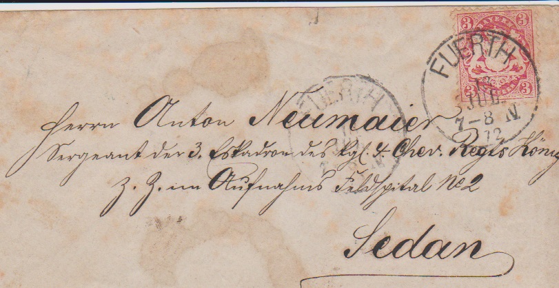 Feldpost, 1872, 3 Kr. rosa auf leider fleckigem Couvert von Fuerth an einen Serganten in Sedan mit rs. blauem Ank.-Ra3 "K. Pr. Feld-Post-Relais No. 27"