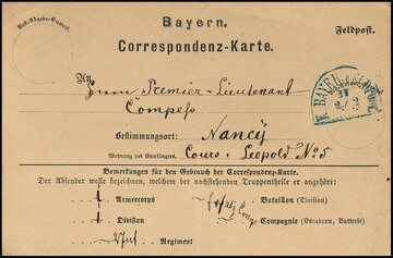 Feldpost, 1870/71, sehr seltener blauer HK "K. Bayer. Feldpost II" auf Correspondenzkarte nach Nancy (Feuser unbekannt), sowie schwarzer Feldpost-HK auf bayerischer Correspondenzkarte, je übliche Gebrauchserhaltung (u.a. Mittelfalte)