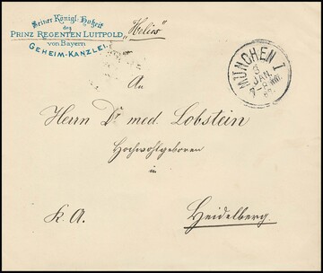 Portofreiheiten, 1887, K1 "München" auf portofreiem Vordruckcouvert der Geheim-Kanzlei von Prinz-Regent Luitpold ("Helios"), als "K.A." nach Heidelberg