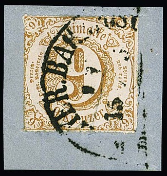 Bahnpost, bayerischer HK "K. BAYER. BAHNPOST" als seltene Fremdentwertung auf Briefstück mit Taxis 9 Kr. ockerbraun (bereits mit senkrechter Faltspur aufgeklebt), Fotoexp. Sem