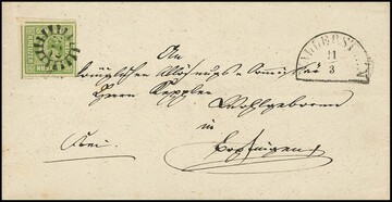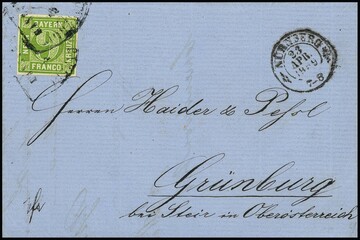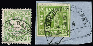 9 Kr. mai- und gelbgrün, je tadellos breitrandige Marken auf zwei Faltbriefen aus Nürnberg 1859. Einmal Marke mit Zug-HK entwertet, der K2 nebengesetzt, der andere Brief Marke mit Plattenfehler