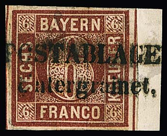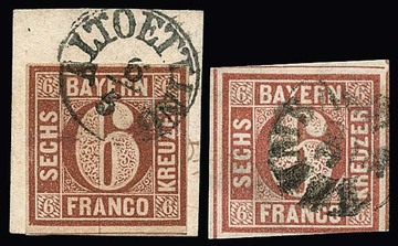 6 Kr. braun, Type I, zwei teils sehr breitrandige Kabinettstücke mit HK ("Höchstadt", "Dettingen") und Federzug, einmal sign. Pfenninger. Mi. 400,-