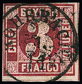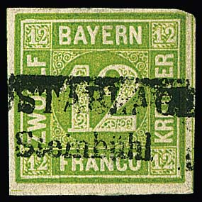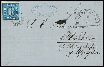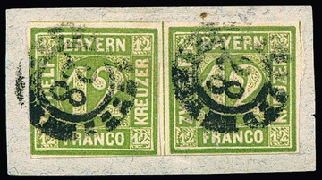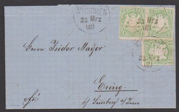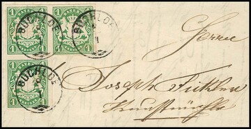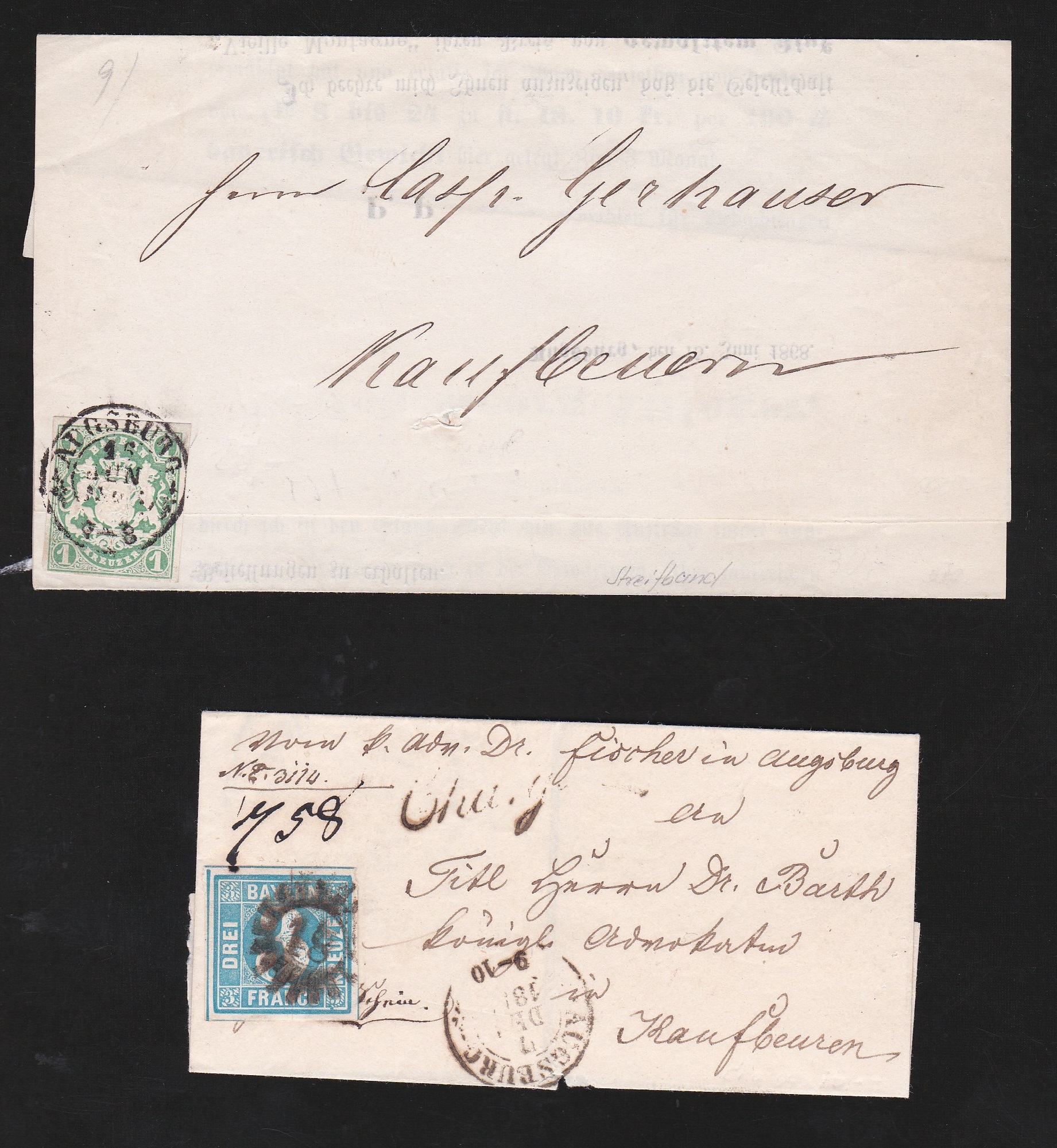 1 Kr. grün auf tadelloser Drucksache, sowie Kabinettstück 3 Kr. blau auf kleinem Chargé-Briefchen, beide aus Augsburg