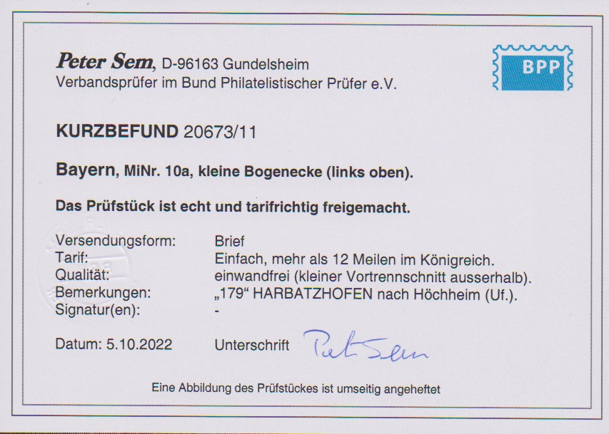 6 Kr. blau, kleine linke obere Bogenecke auf Kabinettbrief mit gMR "179" und HK "Harbatzhofen", Fotoexp. Sem