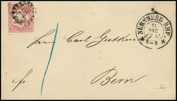 3 Kr. rosa (unbed. Gummispuren) einzeln auf Pracht-Auslands-Drucksache von Nürnberg 1868 nach Bern/Schweiz