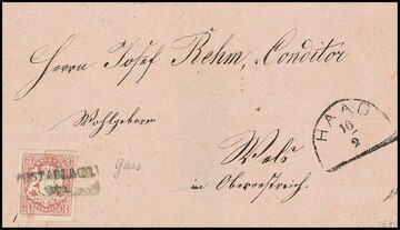 3 Kr. rosa, breitrandig, auf rosa Brief mit blauem L2 "POSTABLAGE Gars" und Neben-HK "Haag" nach Wels (Oberösterreich)
