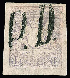12 Kr. mattpurpur, breitrandig, verblasst, mit seltener alleiniger Entwertung durch Stempel "P.D.", sign. Brettl