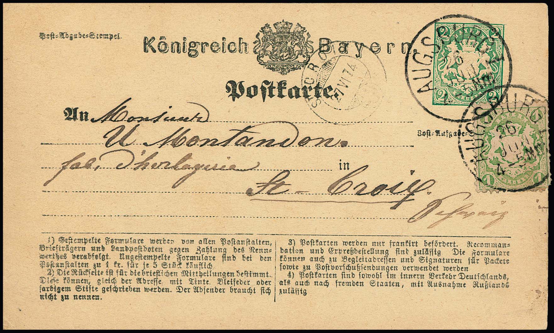 1 Kr. grün (rechts Zahnfehler durch Randklebung) auf Ganzsachenkarte 2 Kr. grün, von Augsburg 1874 in die Schweiz