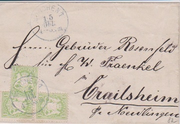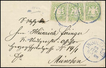 1 Kr. hellgrün per drei auf Kabinettbrief mit blauem K1 "Ingolstadt", Fotoexp. Brettl