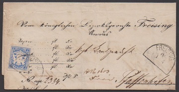 7 Kr. blau, tadellos, auf Vordruckbrief der 2. Gewichtsstufe mit HK "Freising", sign. Brettl