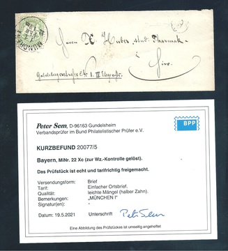 1 Kr. blaugrün einzeln auf hübschem Damen-Orts-Couvert aus München mit nebengesetztem Briefträgerstempel, Marke (ein min. kurzer Zahn) zur Prüfung des Wasserzeichens gelöst, Fotoexp. Sem