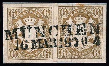 6 Kr. braun, breitrandiges Prachtpaar mit K1 "Augsburg Bahnhof", rechte Marke Seidenfaden oben unbedeutend gelockert, Mi. 380,-