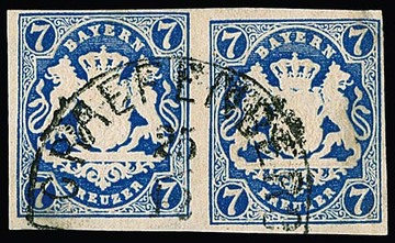 18 Kr. zinnoberrot, sehr breitrandig, unten bis zu 6mm Bogenrand, HK "Kissingen", sowie 1 Kr. dunkelgrün ungebraucht, kl. helle Stelle bzw. Bug, je Fotoexp. Stegmüller. Mi. 580,-