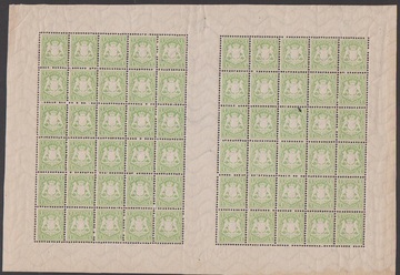 1 Kr. grün (mit Plattenfehler I) sowie 3 Kr. karmin (mit Plattenfehler II, III) je im kpl. postfrischen 60er-Doppelbogen mit sechs Zwischenstegpaaren