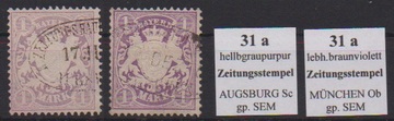1 Mk. violett, zwei Prachtstücke je mit Entwertung durch Zeitungs-Ovalstempel von Augsburg bzw. München, sign. Sem. Mi. 160,- + Stpl.
