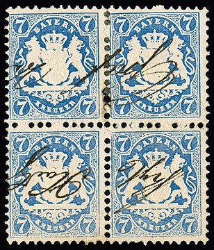 7 Kr. hellblau, oben etwas angetrennter Pracht-Viererblock (zwei Zahnspitzen etwas kürzer) mit handschriftlicher Gerichts-Entwertung