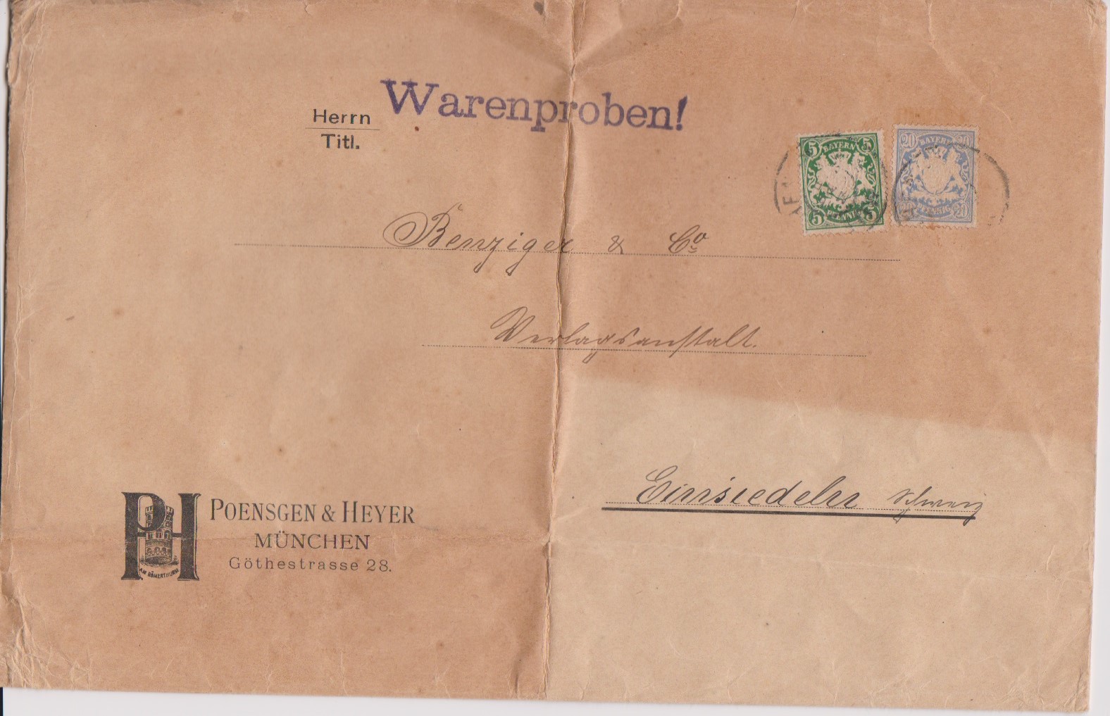 3 Pfg. braun und 25 Pfg. orange auf Orts-Expreßcouvert (rs. kleine Öffnungsmgl.) aus München 1903, ungewöhnliche Portostufe