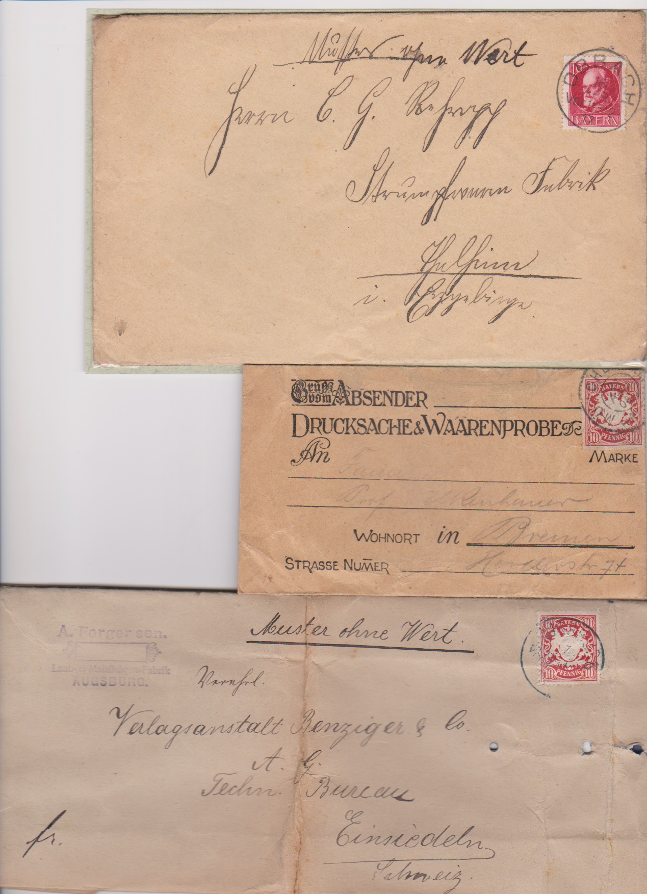 10 Pfg., vier versch. Ausgaben, je als EF auf übergewichtigen "Muster"-Sendungen (ein Auslandsbeutel), sowie 5 und 20 Pfg. (Nr. 55 u. 57) auf ewas fehlerhafter, aber seltener großer Auslands-Warenprobe (250gr.) in die Schweiz
